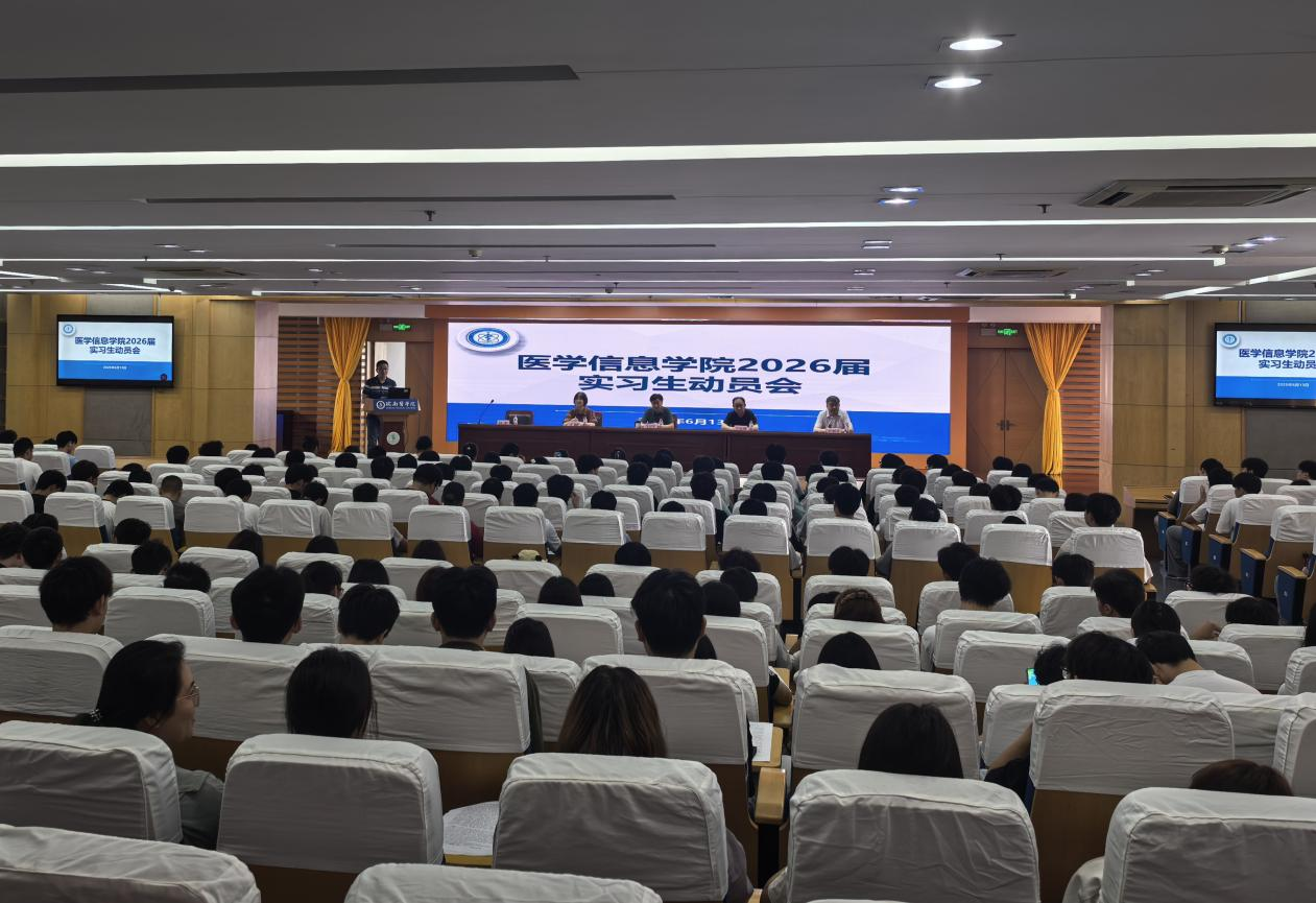 实习动员,思想高度统一。6月13日上午,医学信息学院召开毕业实习动员大会,学院党委书记马同军,党委副书记王颖,副院长叶明全、昌杰,辅导员,学院秘书及2022级全体学生参加动员大会。会上,叶明全作动员讲话,强调了实习对大学生未来职业发展的重要意义,希望同学们严格遵守实习纪律,摆正实习心态,努力找准自身位置。保卫处消防科科长卢举纲作安全教育,提醒同学们实习期间注意个人生命财产安全,谨防诈骗。王颖强调了毕业实习期间要加强工作纪律,并提醒同学们做好未来职业规划。昌杰从毕业论文(设计)目标、选题、样例、重要环节等方面进行指导,要求学生与辅导员及指导老师保持联系,及时汇报毕业论文工作进展情况,顺利完成毕业论文(设计)任务。马同军作总结讲话,表示实习是专业人才培养体系中“承上启下”的关键环节,既是对大学前三年理论学习的实践检验,更是为未来职业发展储备核心竞争力的重要阶段,并结合2022级学生的成长阶段,对同学们的未来发展进行指导与激励。