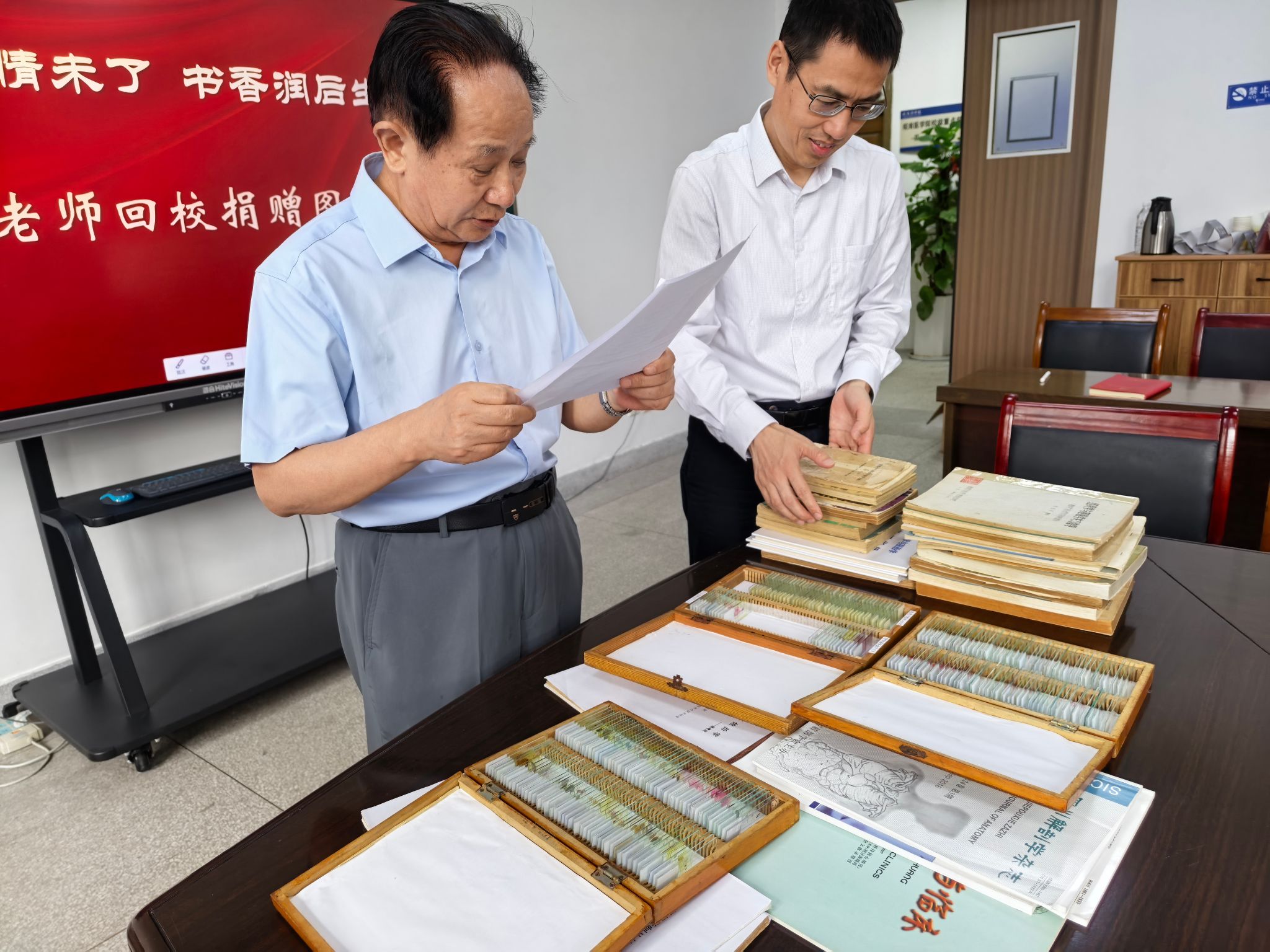 随后,姚老师饱含激情地介绍了此次捐赠的一册册精心挑选、捆扎整齐的书籍,包括组织学与胚胎学图书资料24册、组织切片标本267张、具有参考价值的论文资料5篇以及组织切片技术等手稿资料5本。这些书籍跨越了漫长的时光,从泛黄卷角的页边到清晰工整的批注,无不沉淀着不同时代的学术印记与思想光芒,其价值早已超越了纸张本身,成为一部立体的、可触摸的组织学与胚胎学的教育发展史。